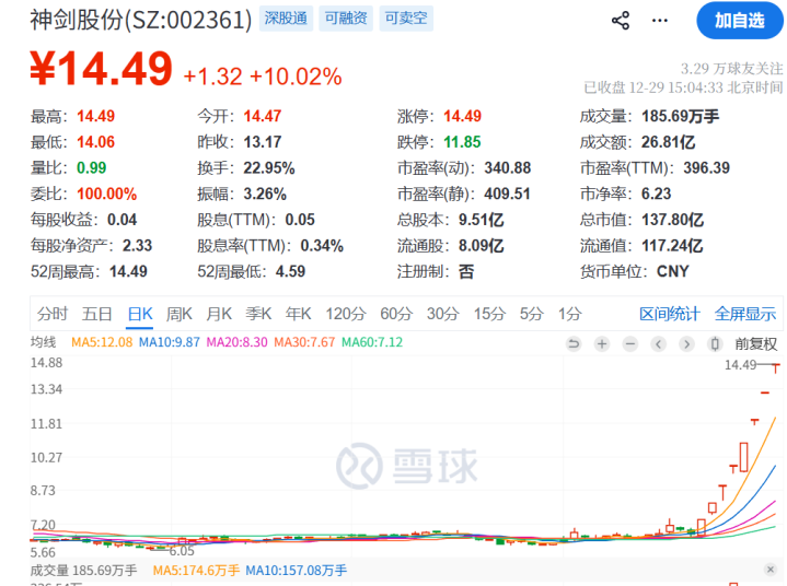 12月29日晚间,连续八个涨停的商业航天概念牛股——神剑股份发布股票交易严重异常波动公告,内容称近期公司股票价格显著偏离大盘指数和行业指数,短期波动幅度较大,已明显偏离市场走势,存在较高的炒作风险,目前公司股价已严重偏离上市公司基本面,未来存在快速下跌的风险。